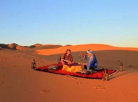 After breakfast, we drive to Tamgrout where a stop at the potteries famous for the green glaze and after the ancient Quranic library with exquisite hand-written Arabic. We will pass through many villages so that you can get a good idea of life in the oasis. Once we get to M’hamid, further south, at the gate to the Sahara where the paved road ends, we will stop for lunch at your leisure. In the evening, you will enjoy one to two hours camel ride leading into the heart of Sahara and to the highest Erg Chigaga dune to enjoy a mermorable sunset. You will enjoy a splendid dinner under the stars next to the campfire while entertained by local music then spend the night in your private tent enjoying the silence and the beauty of the dunes.